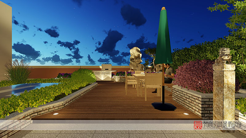 防腐木露台为户外家具提供了一个坚固的平台,同时也为庭院设计提供了一个自然纹理和色调,并与石材铺装形成了鲜明的对比。