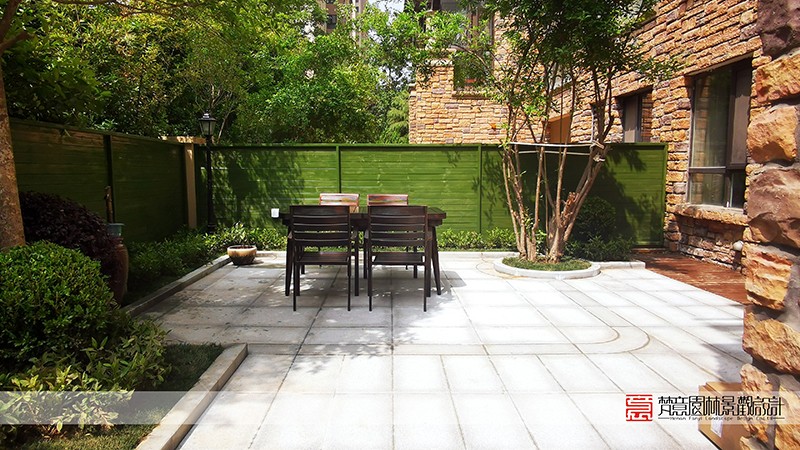 在本案中,庭院设计选择了天然石材进行铺装。同时,利用铺装形式的变化,来进行空间分区。